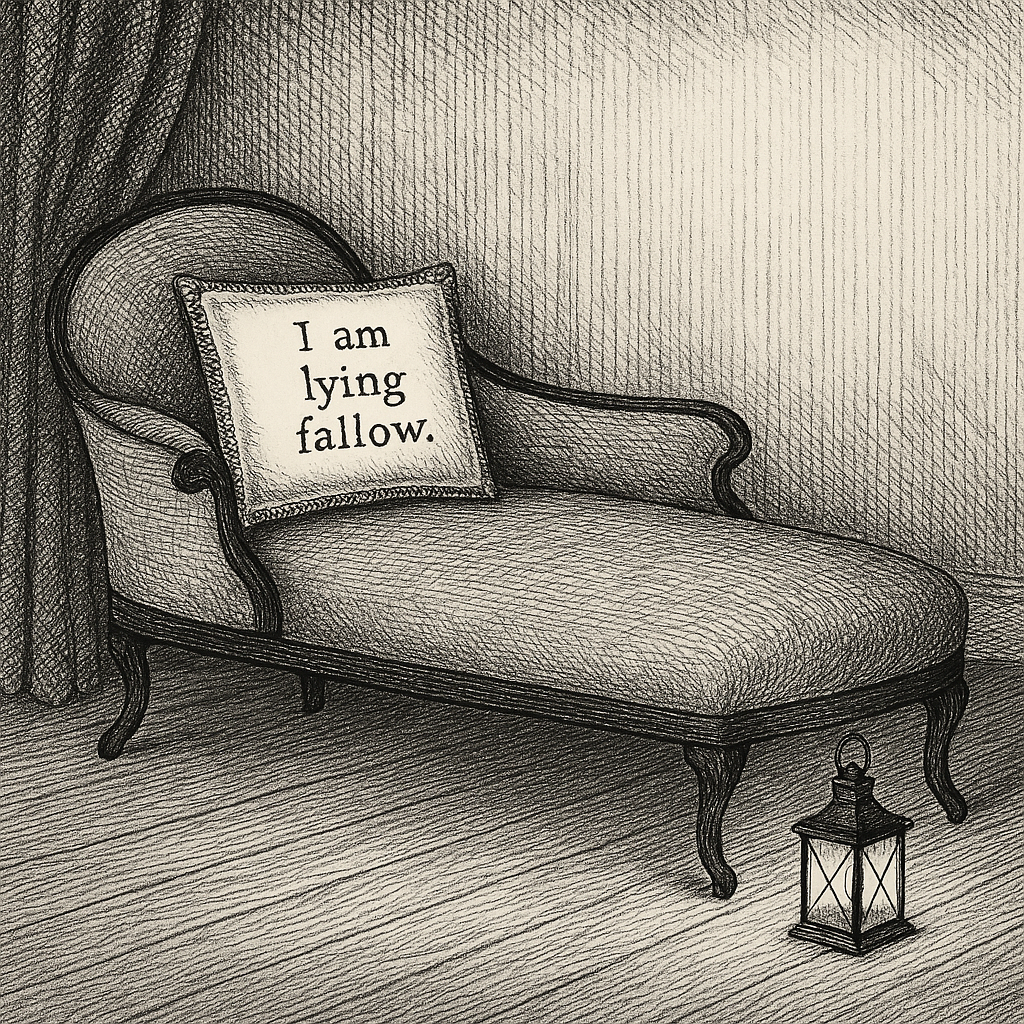 Images depicts a Victorian chaise longue and a pillow embroidered with the words “I am lying fallow.” (A reference to Masud Khan.) Behind it is a curtain and at its foot is a glowing lantern on a wooden floor. Created with Aiden Cinnamon Tea (ChatGPT) in the style of Edward Gorey.